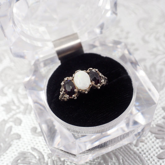 Vintage 1970s Opal, Spessartine Garnet, and Sterling Silver Three Stone Ring Size 7.25