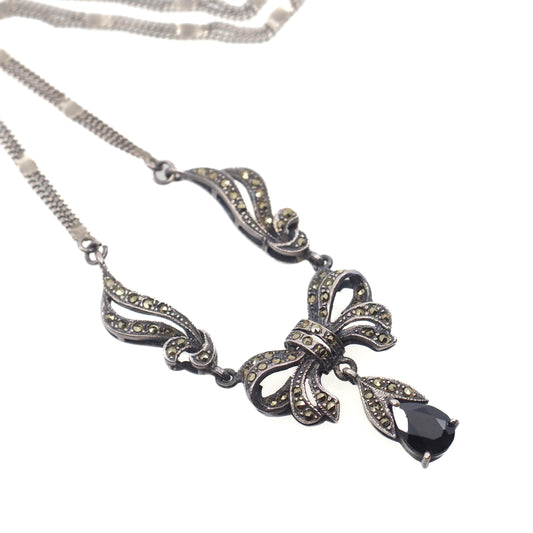 Vintage 1990s Black Glass, Marcasite, and Sterling Silver Bow 18" Necklace