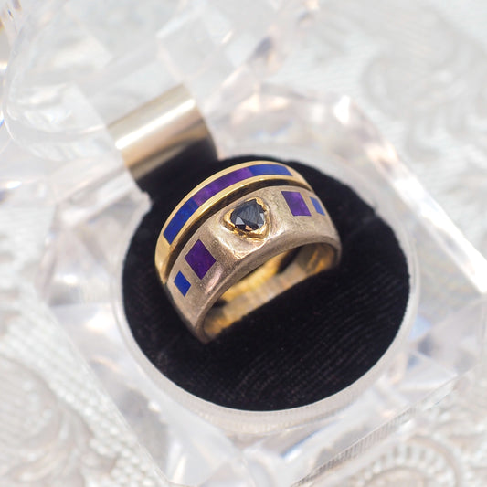 Vintage 1990s Sterling Silver, Lab Sapphire, Sugilite, Lapis, Vermeil Double Band Ring Size 8