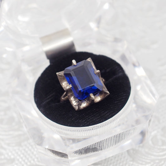 Vintage 1970s Blue Glass Sterling Statement Ring Size 6