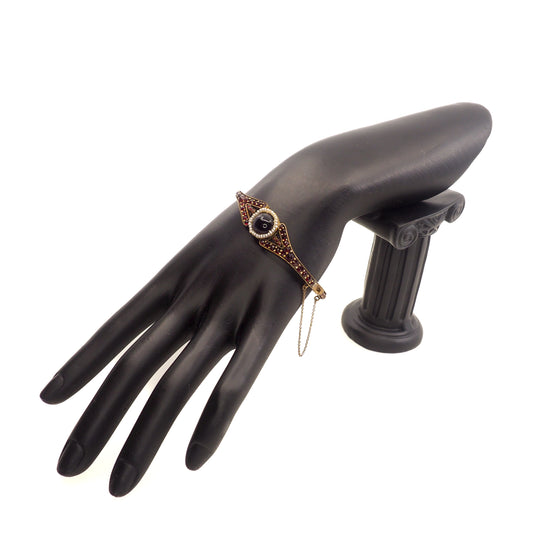 Antique 1890s Victorian Bohemian Pyrope Garnet Seed Pearl Gilt Hinged Bangle 7" Bracelet