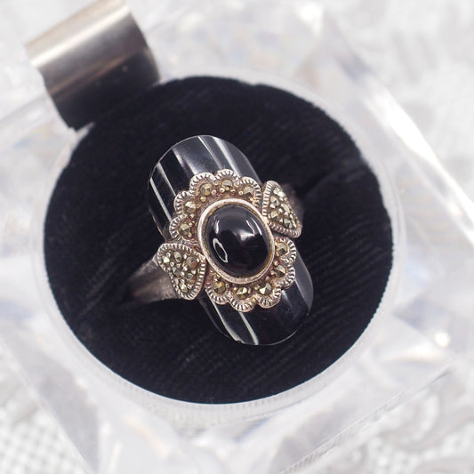 Vintage 1980s Art Deco Styled Onyx, Marcasite and Sterling Silver Statement Geometric Ring Size 8