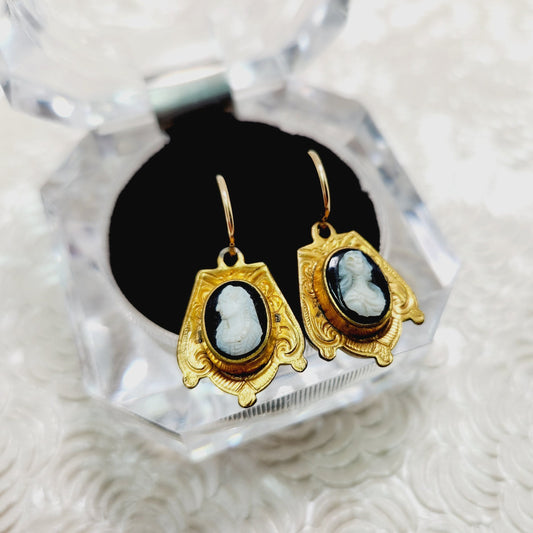 Antique 1870s Mid Victorian Cameo Black Onyx Yellow Rolled Gold Dangle Pierced Mourning Earrings