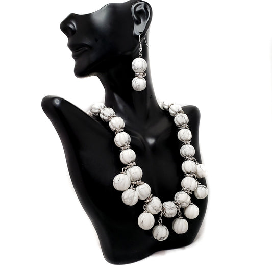 Vintage 1990s White Howlite Melon Bead Chunky Silver Tone Metal Necklace and Earring Large Statement White Jewelry Set