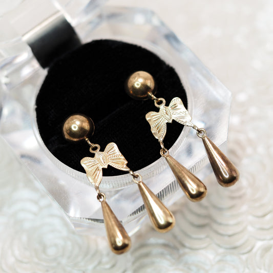 Antique 1900s Late Victorian 14K Yellow Gold Bow Dangle Earrings
