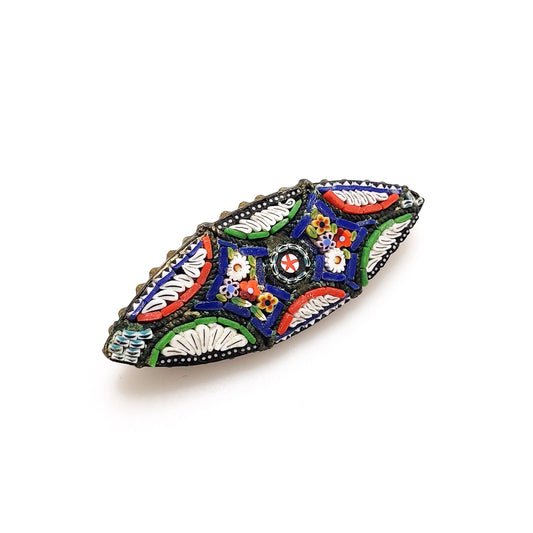 Antique 1910s Italian Mosaic Brass and Glass Small Marquise Colorful Brooch