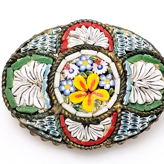 Antique 1910s Italian Micro Mosaic Gold Washed Brass and Glass Flower Brooch