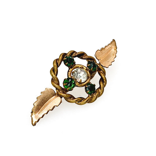Antique 1910s Edwardian Green and Clear Paste and Gold Filled Wreath Leaf Brooch