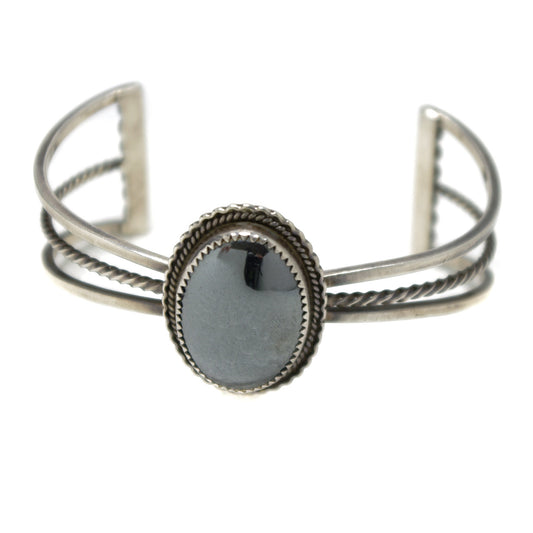 Vintage 1970s Hematite Cabochon Sterling Silver Rope Native American Gemstone 6.5" Cuff Bracelet