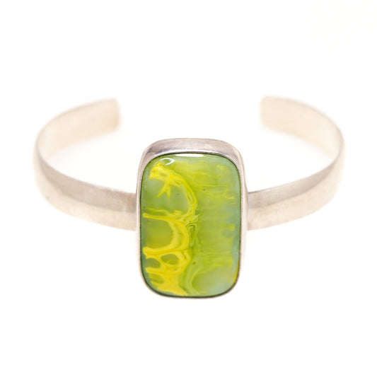 Vintage 1990s Yellowish Green Glass and Sterling Silver Large Statement Cuff 6.75"