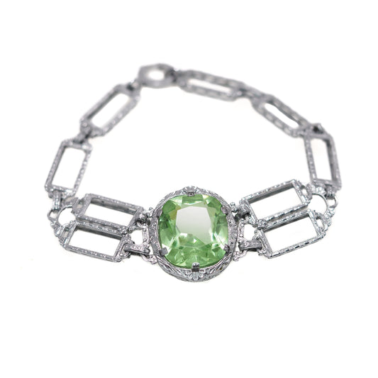 Antique 1920s JH PECKHAM Art Deco Green Glass, Sterling Silver Link 6" Bracelet
