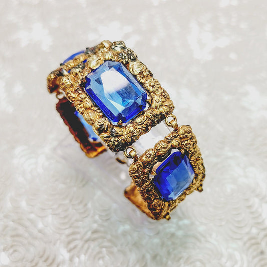 Vintage 1930s Victorian Revival Blue Glass and Gold Plate Floral 6" Bracelet