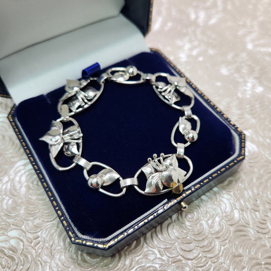 Vintage 1940s Retro Art Deco Sterling Silver Lily Flower Link 7" Bracelet