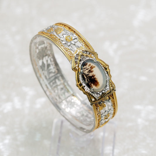 Vintage 1930s JJ WHITE Art Deco Dendritic Agate and Silver Plated Filigree 6.75" Bracelet