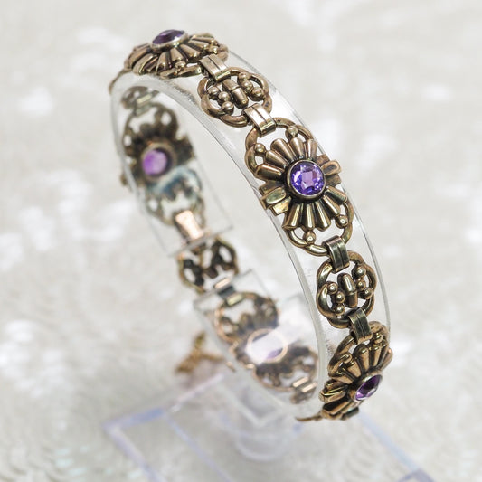 Vintage 1940s Retro Art Deco Purple Glass and Rose Gold Fill Flower Link 7" Bracelet
