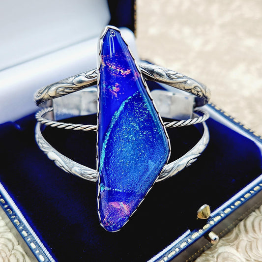 Vintage 1990s Sparkling Glitter Blue Glass and Sterling Silver Statement Adjustable Cuff 6" Bracelet