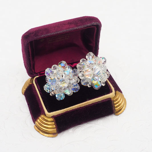 Vintage 1960s Clear Rainbow Aurora Borealis Beaded Silver Plated Cluster Clip-On Earrings