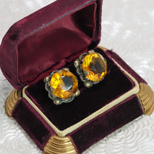 Vintage 1940s Orange Glass Mexico Gold Fill Large Round Cut Orange Non Pierced Silver Statement Earrings