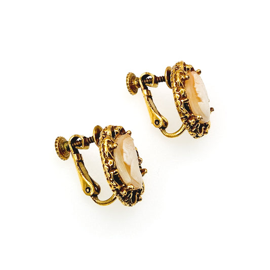 Vintage 1930s Hand Carved Female Figure Pink Shell Cameo Screw Back Clip On Non Pierced Earrings