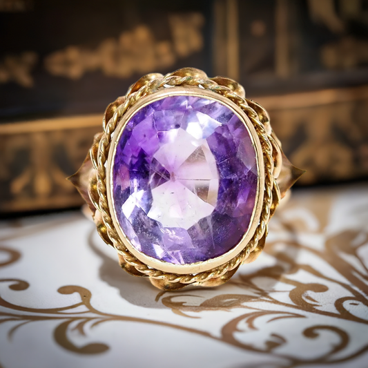 Antique Late Victorian 1880s Etruscan Revival Oval Cut 6.66ct Amethyst 14k Yellow Gold and Amethyst Solitaire Ring Size 7.5