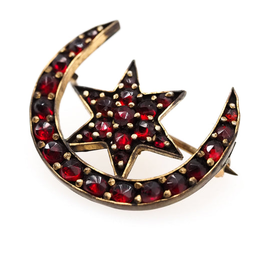 Antique 1910s Rose Cut Bohemian Garnet Star and Crescent Moon Cluster Gilt Brooch