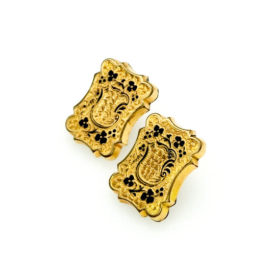 Antique 1870s Victorian Black Taille d' Epergne Enamel Rolled Gold Conversion Pierced Stud Mourning Earrings