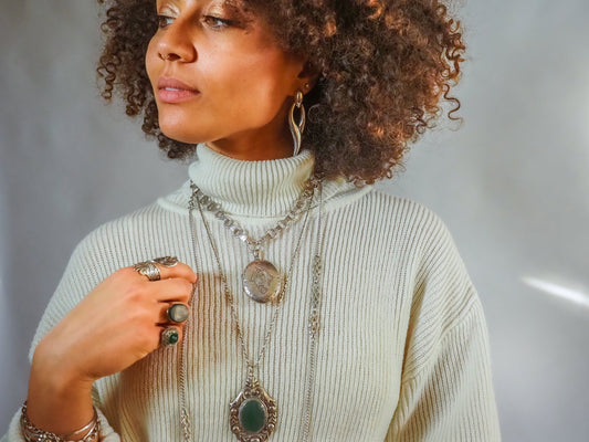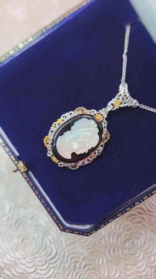 Antique 1920s Art Deco Iridescent Glass, Imitation Onyx, Gold Plate, and Sterling Silver Filigree 18" Necklace