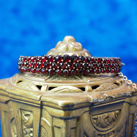 Antique 1900s Victorian Bohemian Garnet and Gilt Bangle 6.75" Bracelet