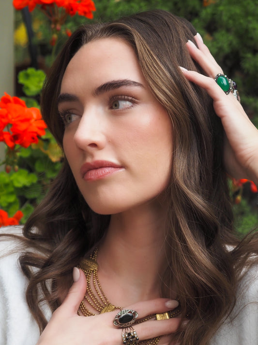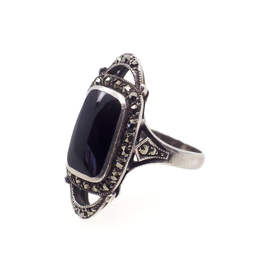 Vintage 1980s Black Onyx, Marcasite, and Sterling Silver Openwork Long Ring Size 7.25