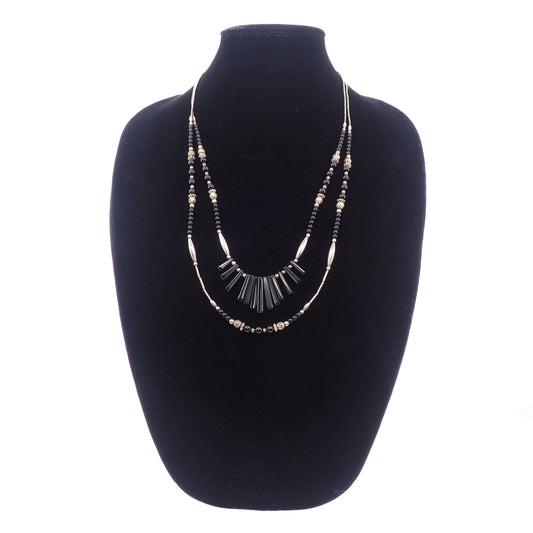 Vintage 1970s Black Onyx and Sterling Silver Collar Bib Double Strand Bead 24" Necklace