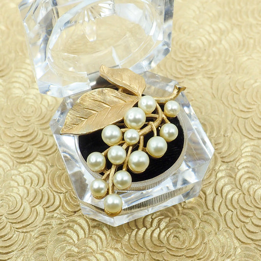 Vintage 1960s TRIFARI Imitation Pearl Gold Plate Leaf Cluster Brooch