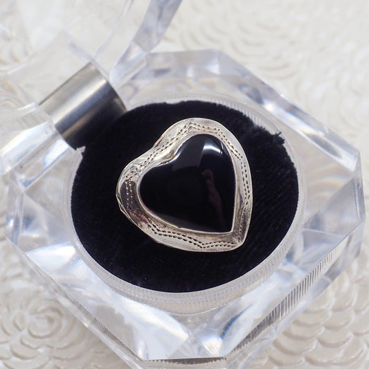 Vintage 1980s Black Onyx and Sterling Silver Heart Locket Poison Ring Size 6