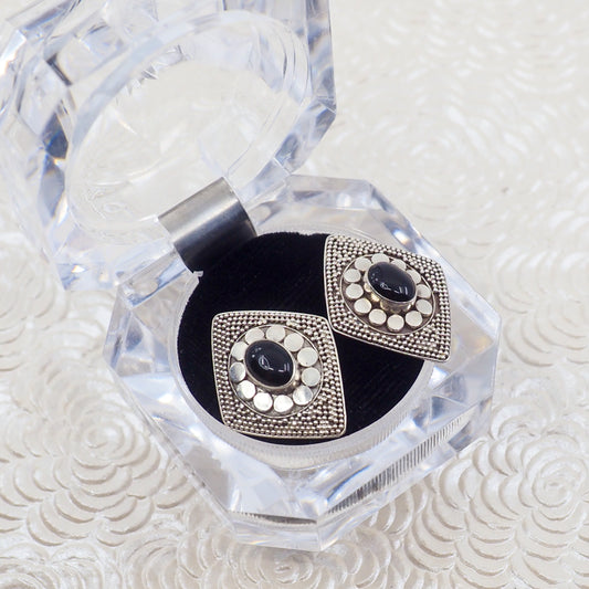 Vintage 1980s Black Onyx Cabochon and Sterling Diamond-Shaped Stud Earrings