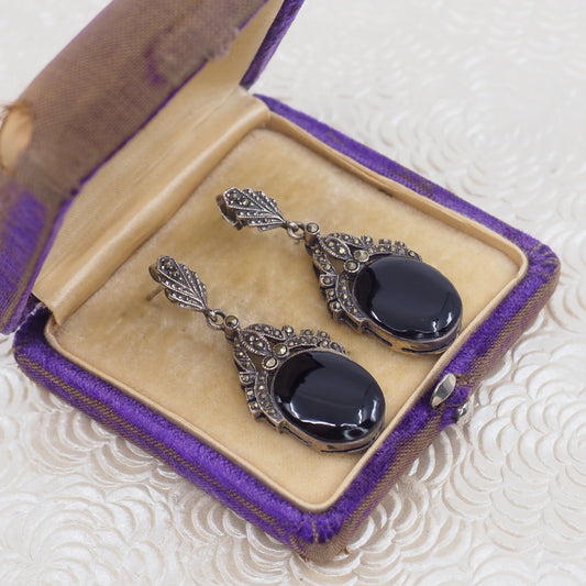 Vintage 1980s Art Deco Style Black Onyx, Marcasite and Sterling Silver Drop Statement Pierced Earrings