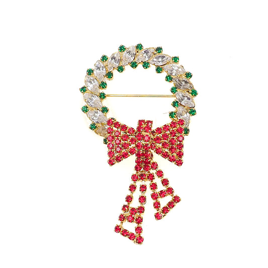 Vintage 1960s Red and Green Rhinestone Chunky Wreath Brooch - 60s Yellow Gold Plate Christmas Unisex Statement Brooch