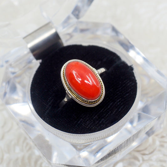 Vintage 1990s Italian Red Salmon Mediterranean and 800 Silver Cabochon Solitaire Ring Size 9.25