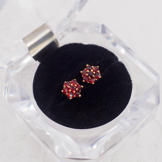 Vintage 1990s Red Round Cut Pyrope Garnet and Rose Gold Washed Silver Cluster Earrings