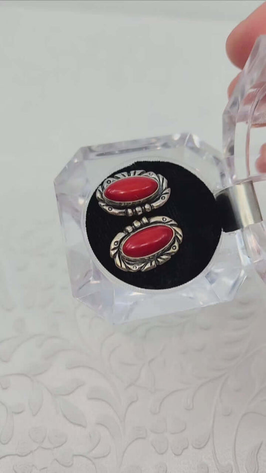 Vintage 1990s Sterling Silver and Red Coral Stud Southwest Pierced Earrings
