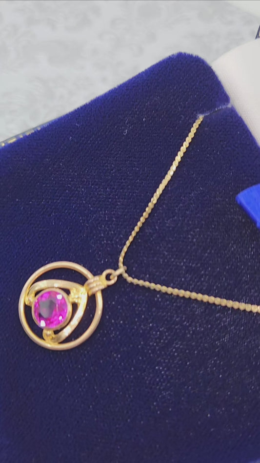 Vintage 1970s Pink Glass and Yellow Gold Filled Pendant 18" Necklace