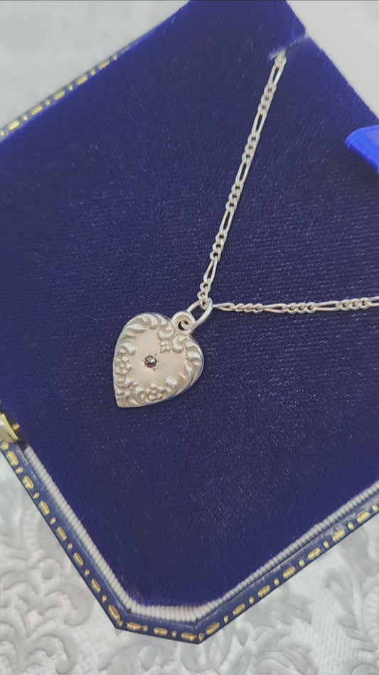 Antique 1890s Victorian Heart Red Garnet and Silver Pendant Choker 16" Necklace