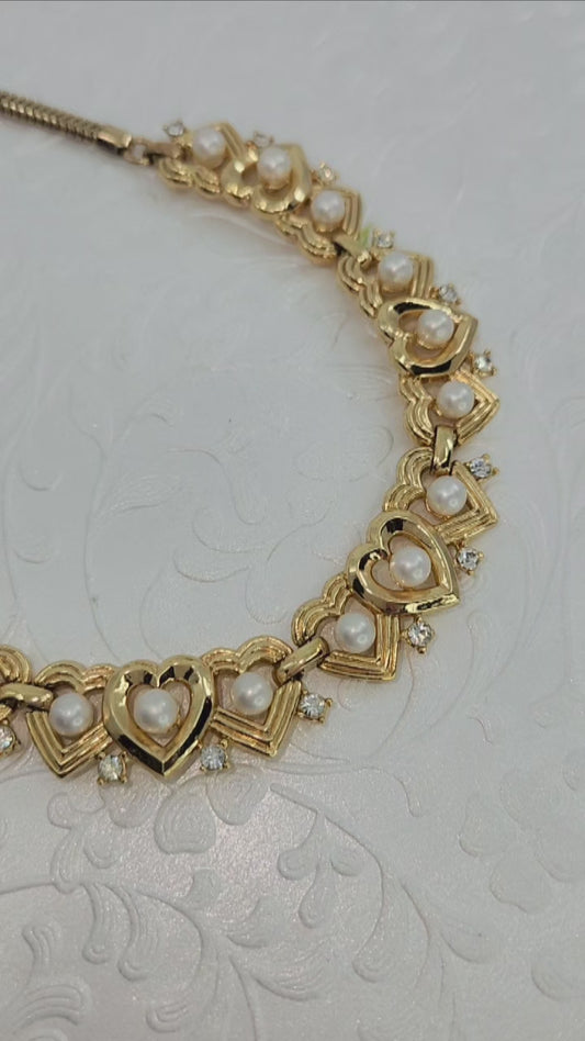 Vintage 1960s TRIFARI Imitation Pearl Gold Plate Heart Choker Necklace