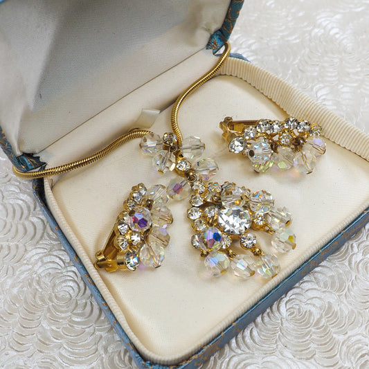 Vintage 1960s Aurora Borealis Rainbow Glass Bead Necklace and Clip-on Earring Jewelry Set