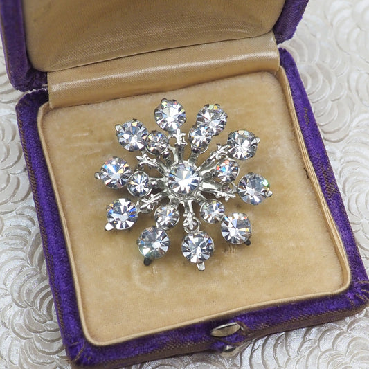 Vintage 1950s Starburst Flower Clear Rhinestone Atomic Fleur-de-Lis Costume Brooch