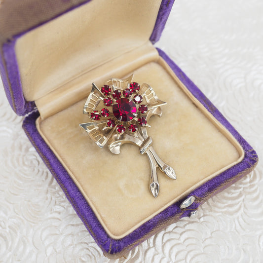Vintage 1980s Gold Tone and Red Rhinestone Flower Brooch