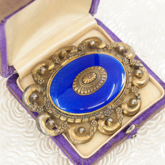 Vintage 1930s Victorian Revival Guilloché Blue Enamel and Gilt Statement Dress Clip