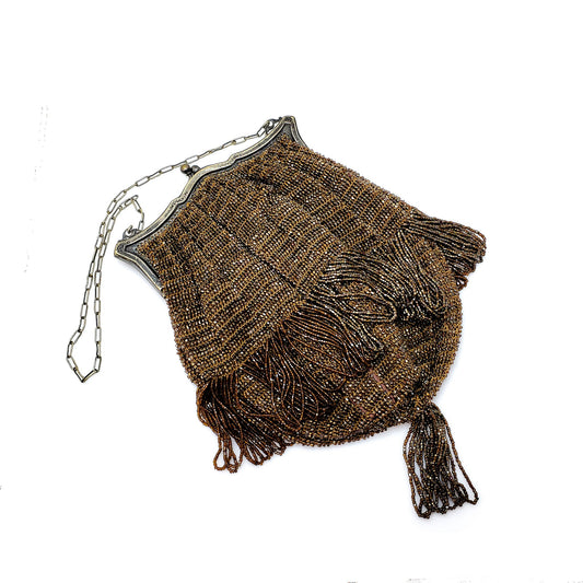 Antique 1910s Edwardian Brown Seed Bead Tassel Evening Bag Formal Purse