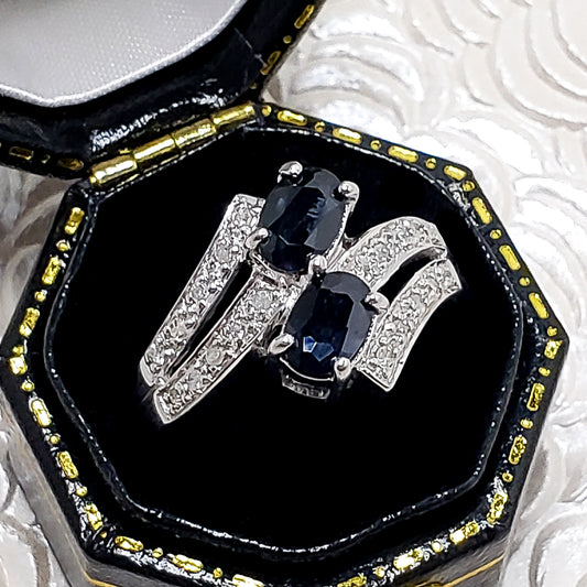 Vintage 1990s Blue Natural Sapphire, Diamond, 10k White Gold Bypass Ring Size 4.75