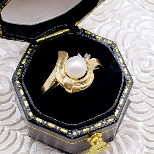 Vintage 1970s Cultured Japanese Akoya Pearl, Diamond, and 10k Yellow Gold Ring Size 6.75