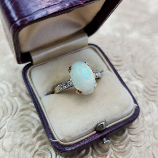 Vintage 1930s Art Deco Opal Cabochon, Diamond, and Two Tone 18k Gold Ring Size 7.75