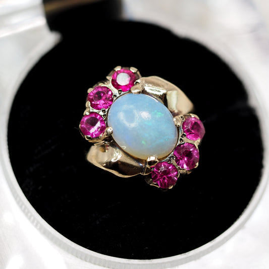 Vintage 1940s Art Deco 10k Yellow Gold, Opal and Lab Created Ruby Ring Size 7